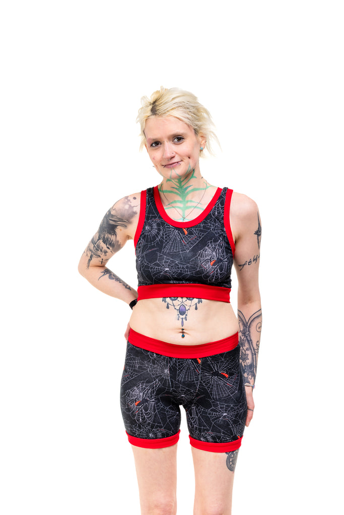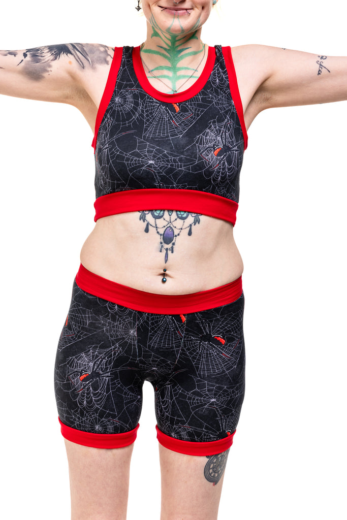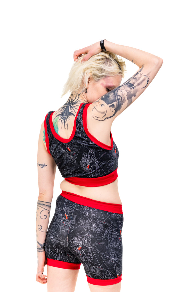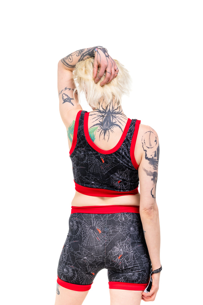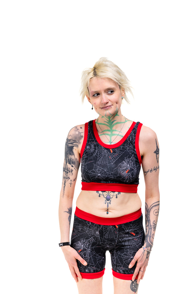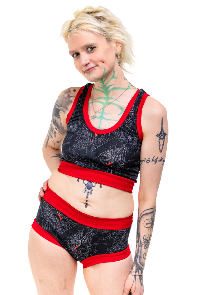 Get tangled up in gothic glam with the Black Widdow Comfort Top — a spiderweb print crawling with Black Widow vibes. Choose your band colour (black or red) and your style (vest back or racer back), because spooky chic deserves options.