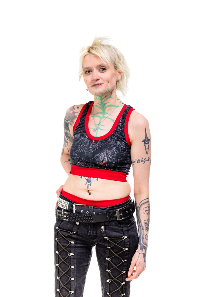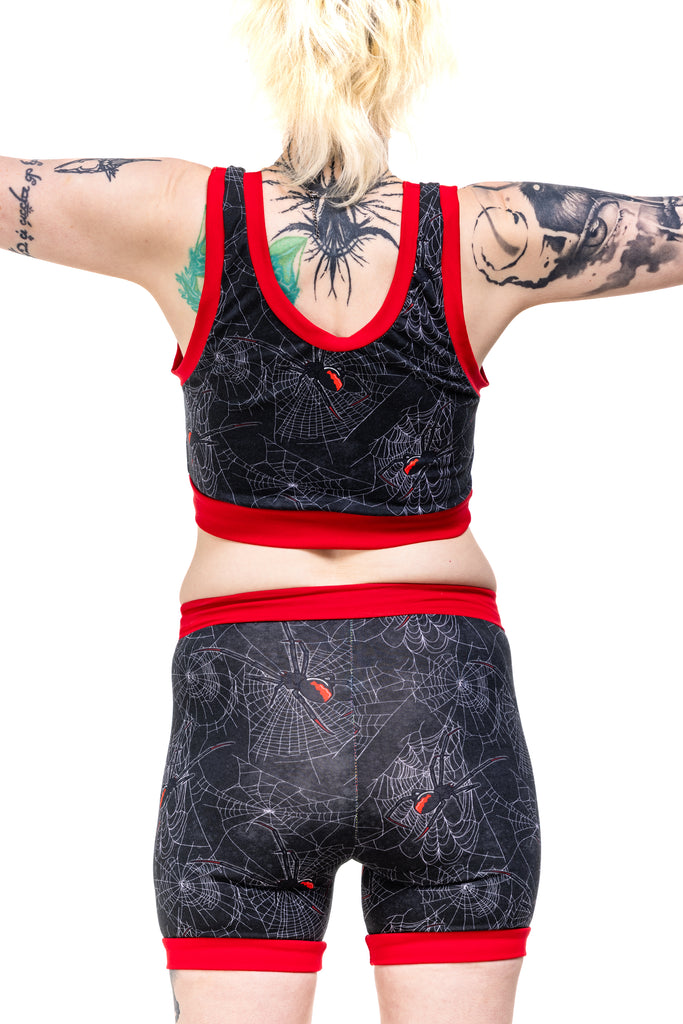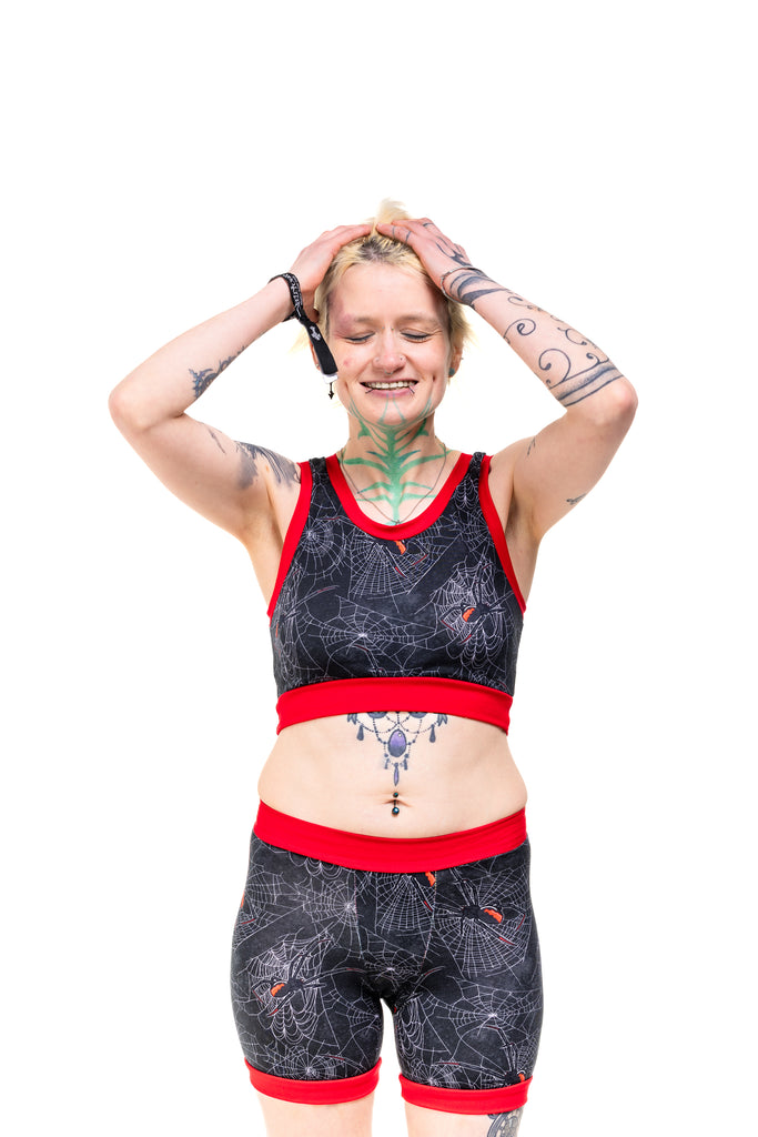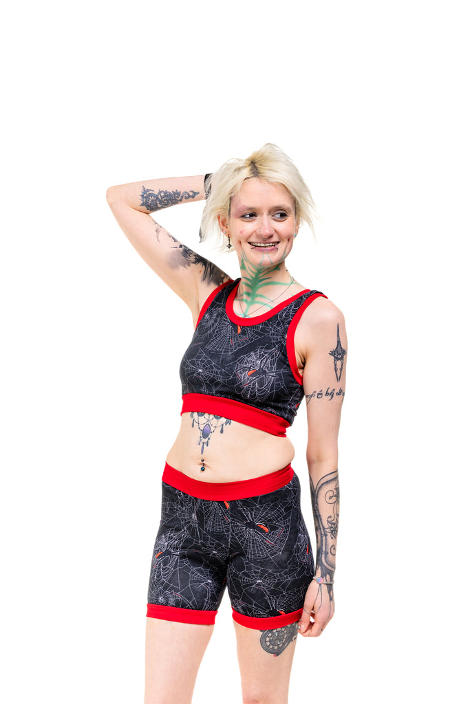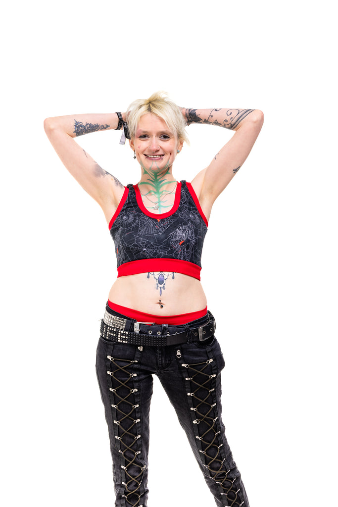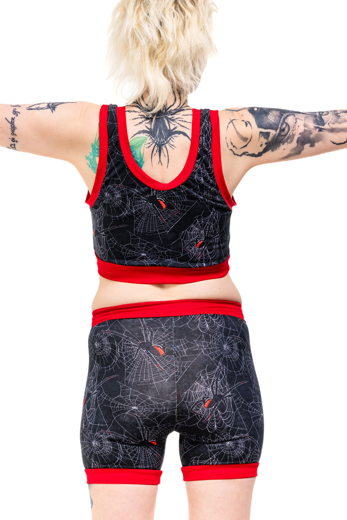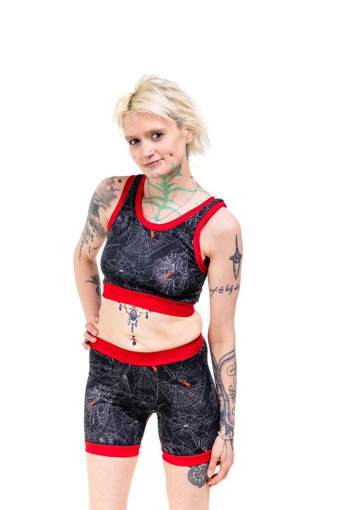 Get tangled up in gothic glam with the Black Widdow Comfort Top — a spiderweb print crawling with Black Widow vibes. Choose your band colour (black or red) and your style (vest back or racer back), because spooky chic deserves options.