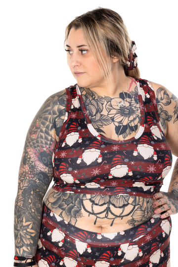 Debz (the founder) measures as underbust 37"/ overbust 47" and wears an XL Racerback top