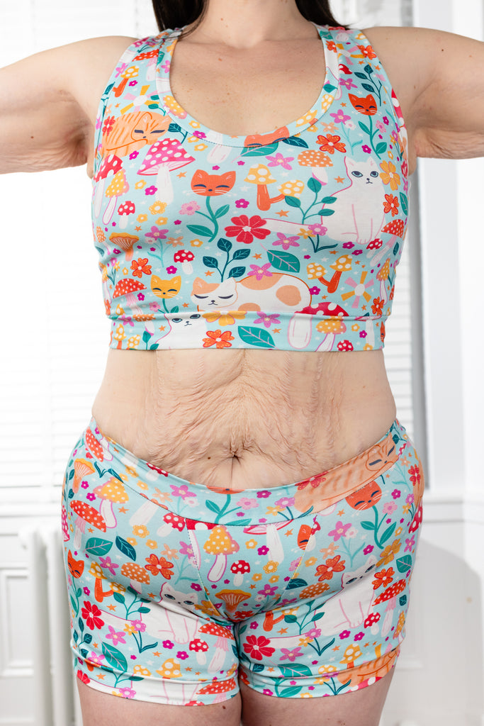 Unleash your wild side with this cozy top featuring a collaboration between Carly Watts and Wilde Mode. Adorned with sleepy kitties and shrooms, this comfort top is perfect for lounging or adding a playful touch to your outfit. (Meow-tastic and fungi-dorable!)
