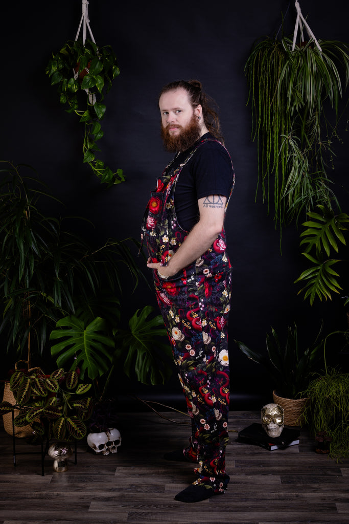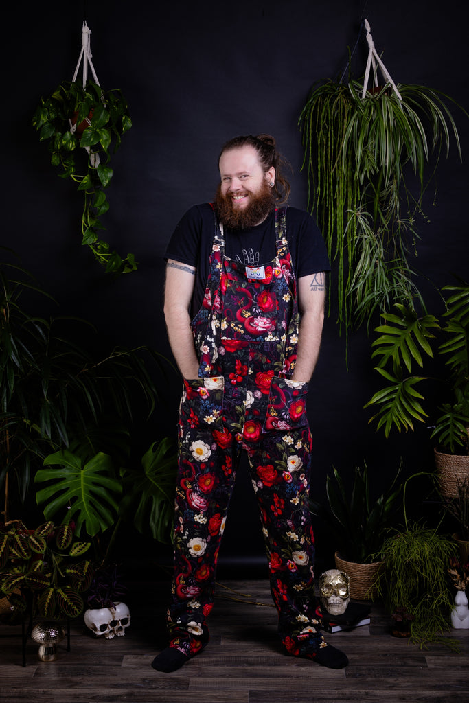 Paul He/Him is wearing a 6xl dino dungaree in an extra long body length and 31" inside leg. He wears 54" waisted jeans
