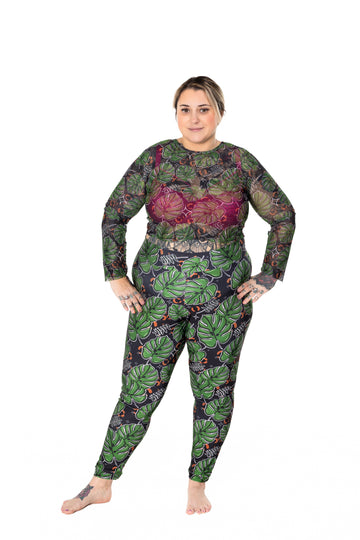 Turn heads and rustle some leaves with the Wilde Mode x Voodoochaos Monstera Long-Sleeve Fine Mesh Crop Top. This sheer little stunner serves maximum drama with minimum effort — bold Monstera print, long sleeves, and a cropped cut that’s ready for layering, dancing, or just living your extra life.